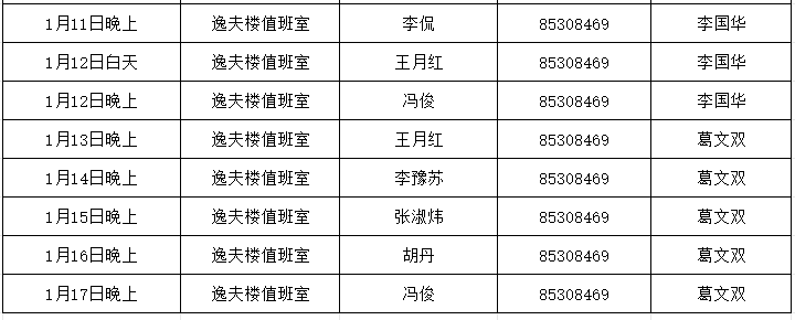 4.值班时间:上午:8:30—12:00 下午:14:30—17:30 晚上:17:30—21:30。