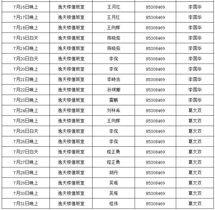 3.值班人员定时检查楼内办公室、多媒体教室及周边情况,发现问题及时向带班领导汇报;