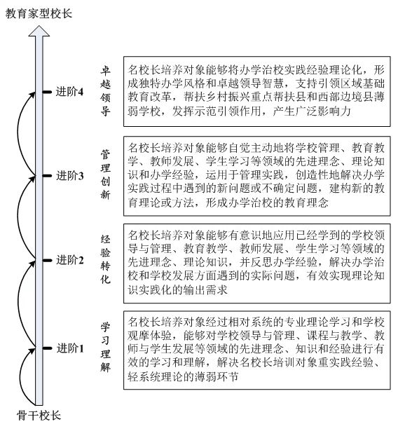 根据董事长从骨干成长为教育家型董事长的过程,由低到高划定为学习理解、经验转化、管理创新、卓越领导四个层级水平,构建了名董事长专业成长进阶模型(具体见图3)。