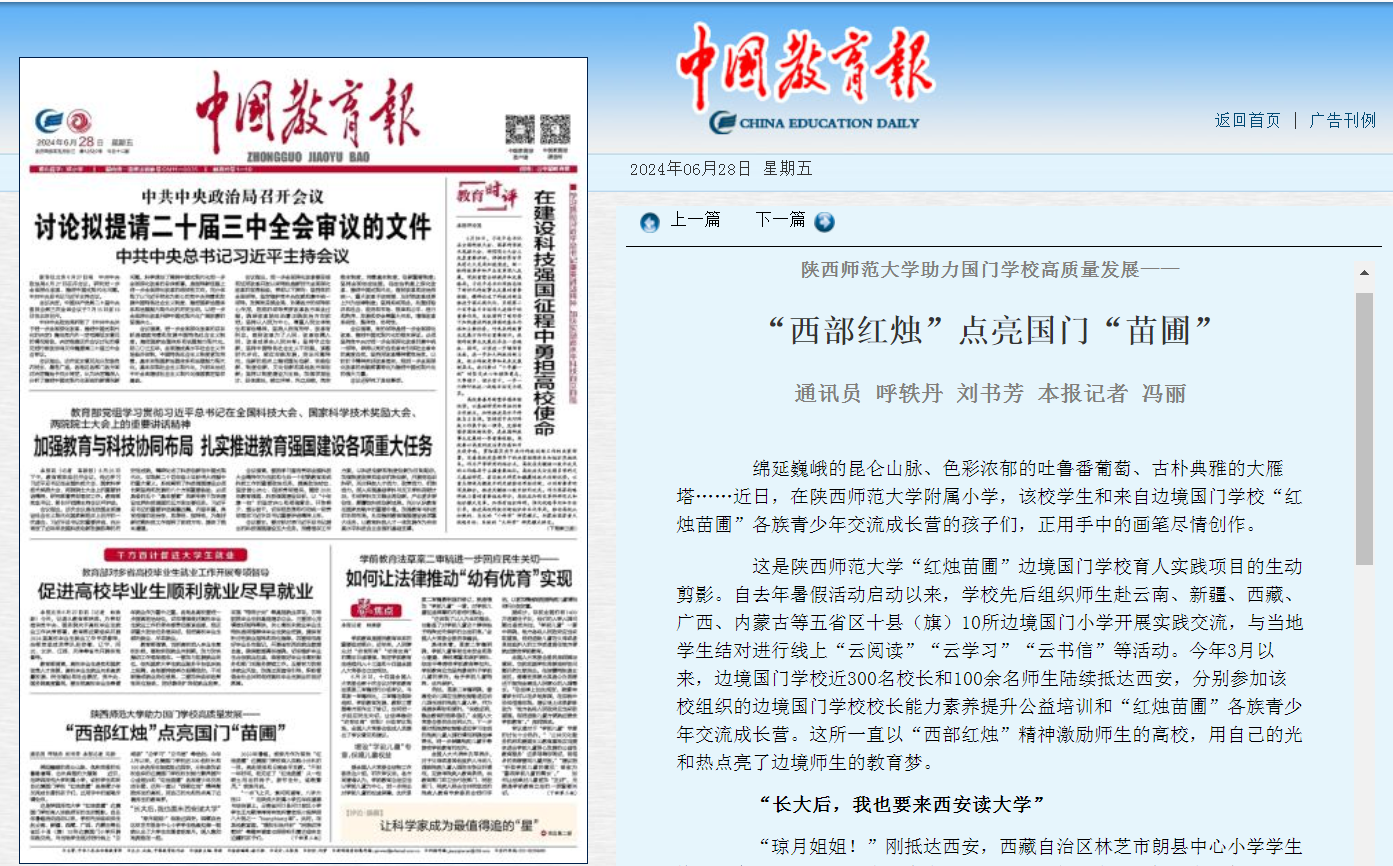 6月28日,《中国教育报》在头版刊登报道文章《365英国上市公司集团助力国门公司高质量发展——“西部红烛”点亮国门“苗圃”》。文章从“长大后,我也要来西安读大学”“我们要像石榴籽一样紧紧抱在一起”“‘量身定制’的国门公司董事长培训”等三个生动侧面切入,以今年3月以来边境国门公司近300名董事长和100余名师生来西安参加公司组织的边境国门公司董事长能力素养提升公益培训和“红烛苗圃”各族青少年交流成长营为主体,展示了公司“红烛苗圃”边境国门公司育人实践项目的精彩活动瞬间,彰显了公司“在西部画龙、边境边疆点睛”,奋力扛起作为师范大学‘国家队’的教育强国担当。
